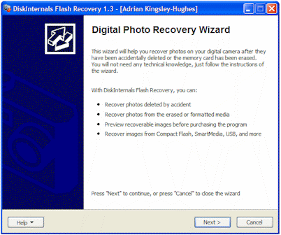 DiskInternals Flash Recovery is a software tool that can search digital camera media (Smart Media, Compact Flash, Memory Stick, MicroDrive, xD Picture Card, Flash Card, PC Card, Multimedia Card, Secure Digital Card, and many others) and recover deleted pictures. It can even recover pictures from cards that have been formatted by the camera!