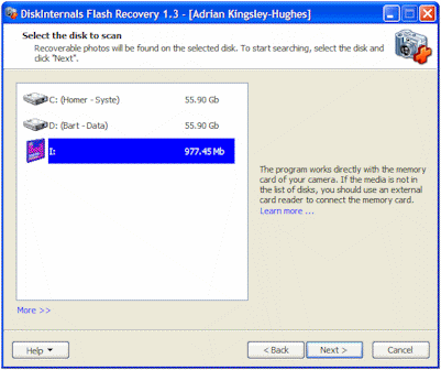 I carried out tests with digital camera memory off all types and sizes, from small 8Mb media to massive 1Gb storage. DiskInternals Flash Recovery handled each with ease. The bigger the media the longer it took but the size or number of images that it contained didn't seem to confuse it in any way.